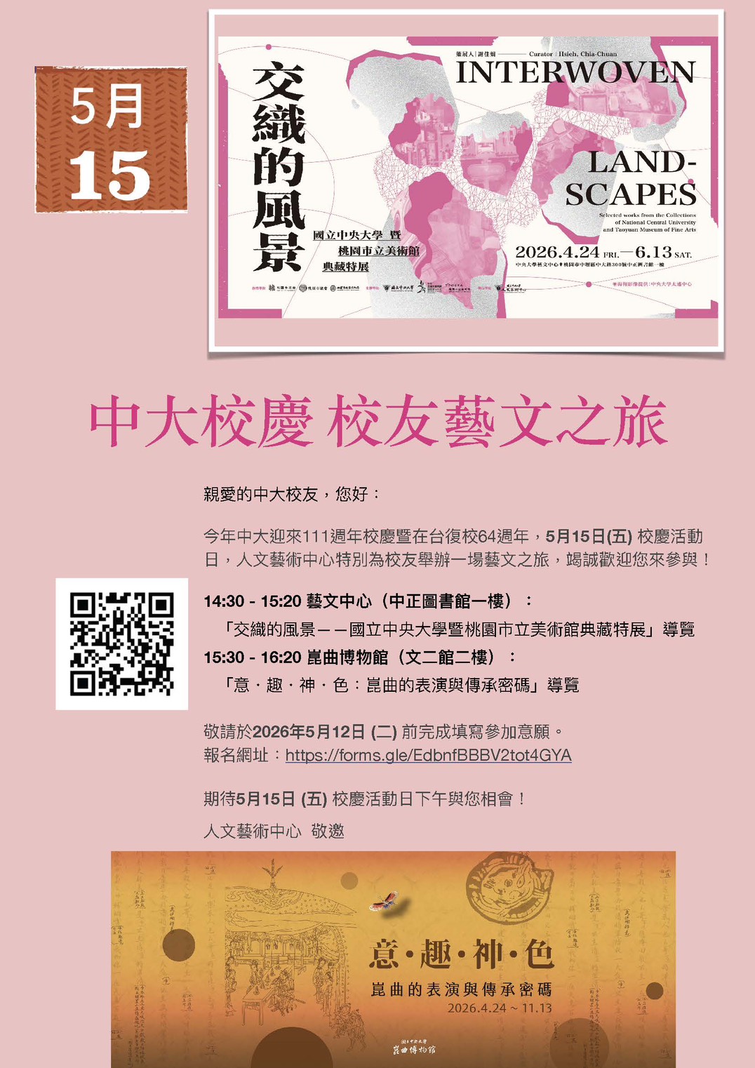 | 2026/04/17 | 2026/05/15 | 5/15 中大校慶 校友藝文之旅 | 2026-04-17 |
